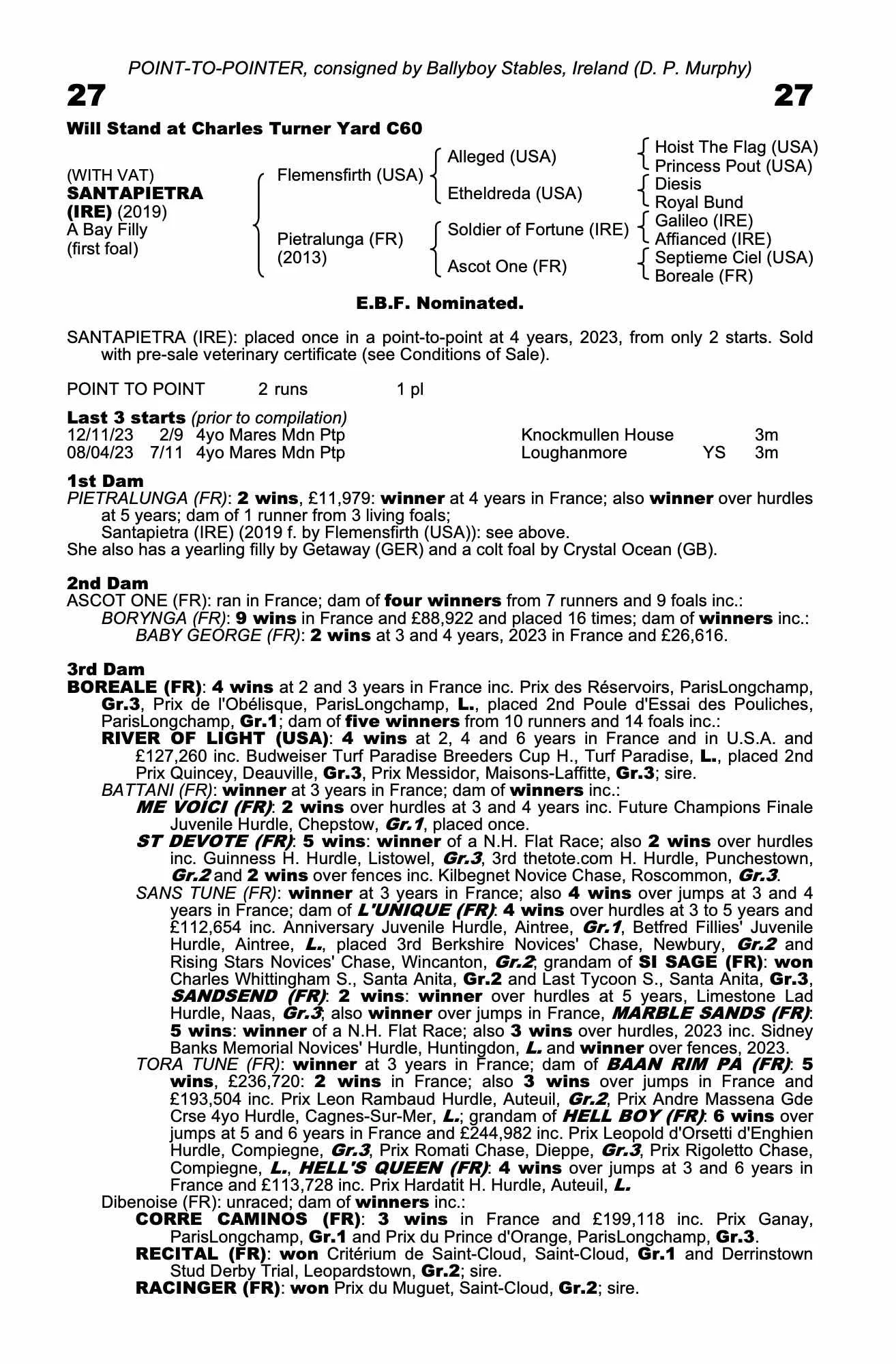 Santapietra was bought from Dennis Murphy’s Ballyboy Stables, whose recent winning graduates include Grangeclare West (purchaser: Cheveley Park Stud), An Tobar (purchaser: Robcour), Croke Park (Gigginstown House Stud), and Corrigeen Rock (Lucinda Russell and Paul McIvor).